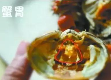 打开蟹壳,看到壳上沾有一些蟹黄,蟹胃就藏在壳子的蟹黄里,呈三角形状。蟹胃很脏,不建议食用。