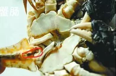 蟹肠位于蟹脐中间,呈条状,由蟹胃通到蟹脐的一条。