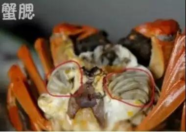 打开蟹壳后在蟹身上的两排灰色扇状软绵绵的组织,这两排“小扇子”就是蟹腮。蟹腮是螃蟹的呼吸系统,不宜食用。