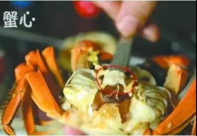 蟹心俗称六角板,位于蟹黄中间,紧连着蟹胃。中医常说螃蟹极寒,而蟹心为最。