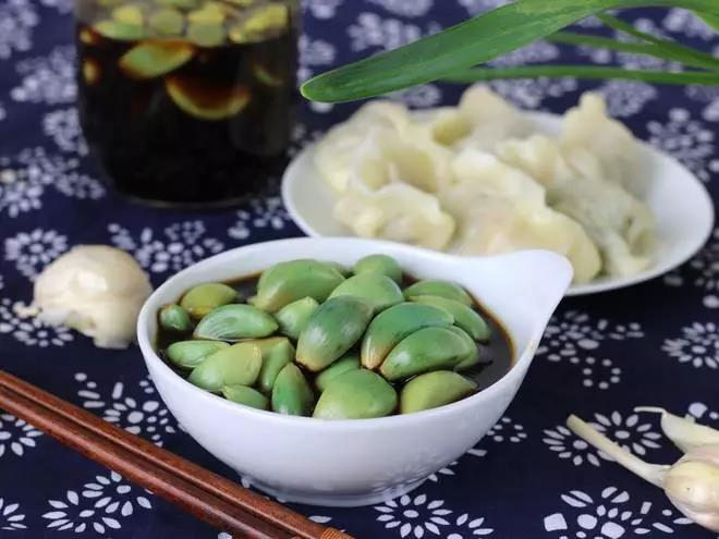 腊八这天用醋泡蒜,到年三十那天拿出来吃,蒜碧绿脆而不辣,醋浓鲜,配上饺子,堪称完美组合!在醋的作用下大蒜的辛辣味儿被中和,带着醋的爽感,佐饺子、配凉菜都是一绝。