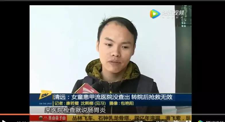 6岁的女儿小怡 因错失流感治疗时机失去生命。 雷先生带6岁的女儿小怡(化名)到广东清远当地浸潭医院看病。诊断结果显示:小怡患的是支气管肺炎和急性胃炎。 医生给小怡打了针、吃了药,小怡却突然出现呕吐,四肢发黑 发冻的情况。办理住院后,小怡的病情并无好转,整晚很痛苦。