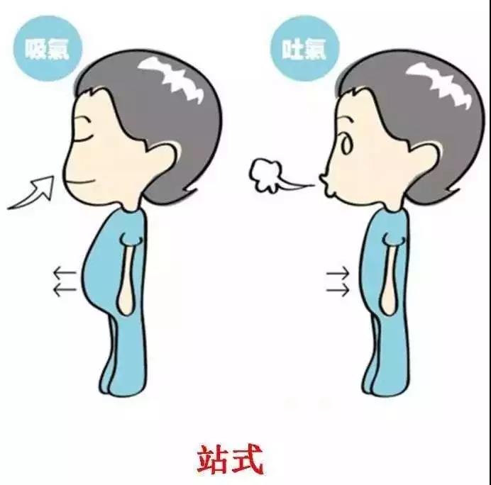 然后,双手叉腰,交替单腿抬高4~8次,抬起时吸气,恢复时呼气。展臂吸气、抱胸呼气轮替进行4~8次。最后,隆腹深吸气、弯腰缩腹呼气各4~8次。