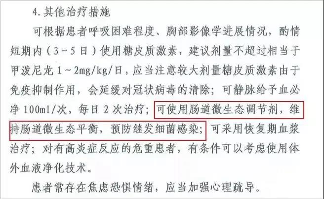 2月5日,国家卫生健康委员会发布了《新型冠状病毒感染的肺炎诊疗方案(试行第五版)》,在治疗措施方面有明确提到“可使用肠道微生态调节剂,维持肠道微生态平衡,预防继发细菌感染”。