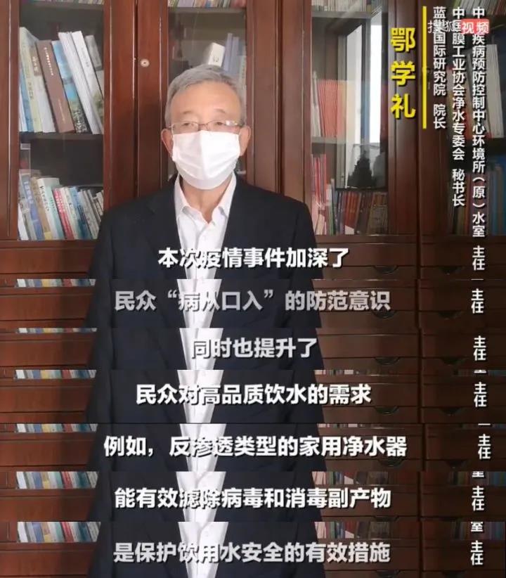 中国膜工业协会净水专委会秘书长、原中国疾病预防控制中心环境与健康相关产品安全所水室主任鄂学礼研究员,日前针对新冠肺炎疫情在中国发作,通过视频指出: