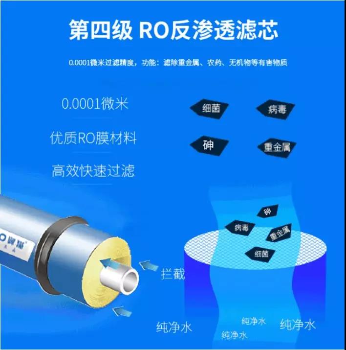 如此强大的过滤效果,因为它的过滤核心采用了美国陶氏的RO反渗透膜片,过滤孔径仅有0.0001微米,相当于头发丝的十万分之一,哪怕是肉眼看不到的有害物质也无法通过。