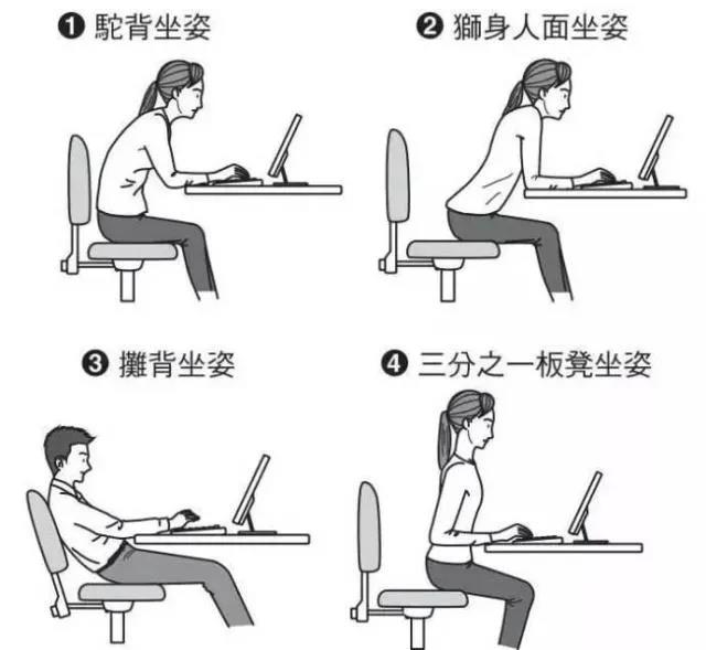 正常情况下,腰部向前凸,而骶骨则向后凸,从而形成正常的生理弯曲。然而,办公室一族的坐姿多是耸肩、含胸,再加上使用电脑时双手向前伸以及伏案等姿势都加重了脊柱的负担。