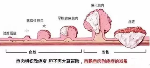 目前,已明确至少80-95%的大肠癌都是从肠息肉一步一步“进化”过来:小息肉→大息肉→重度不典型增生→原位癌→浸润性癌。
