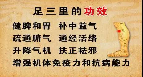 足三里(膝眼直下3寸处)是“足阳明胃经”的主要穴位之一,每日按揉50~100次,能健脾和胃、调中理气、导滞通络,适用于各种类型的脾胃病变。