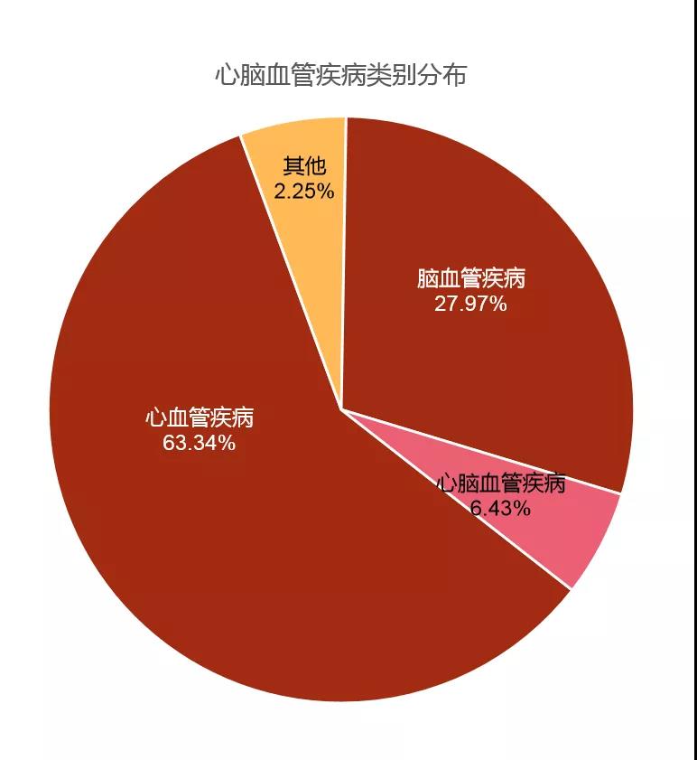 中青年心脑血管患者疾病种类分布中,患病部位主要集中在心脏,患心血管疾病的占63.34%,患脑血管疾病的占27.97%,剩下两者兼有的为6.43%(下图)。