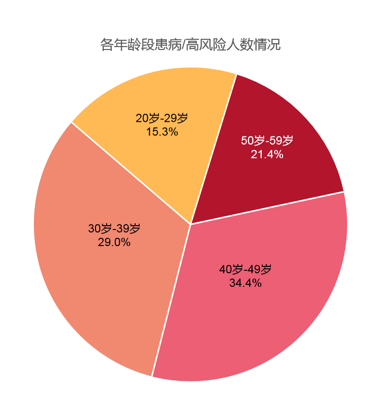 中国心脑血管疾病年轻化趋势明显,30-39岁的患病/高风险人群占比29.0%,40-49岁占比最高达到34.4%(下图)。