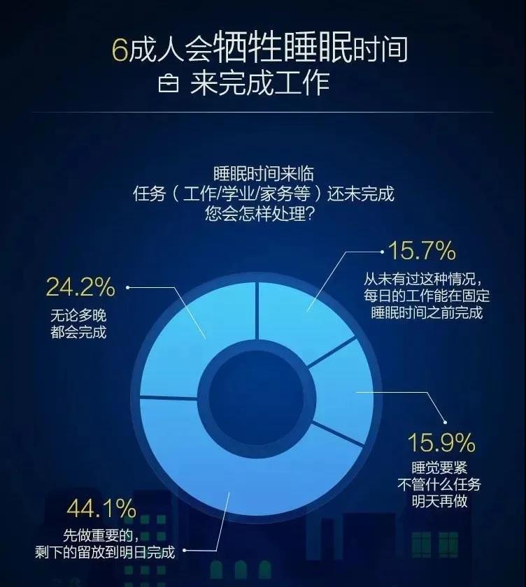 据统计,六成人会牺牲睡眠的时间,完成工作。30.5%的人经常为了工作早起,21.6%的人做梦梦见过工作,12.9%的人出现过越工作越精神的情况。