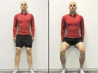 离墙30厘米远站立,双脚打开与臀部同宽,双脚方向与膝盖方向一致。后背靠着墙下蹲,使重心向后,减少膝关节的受力。