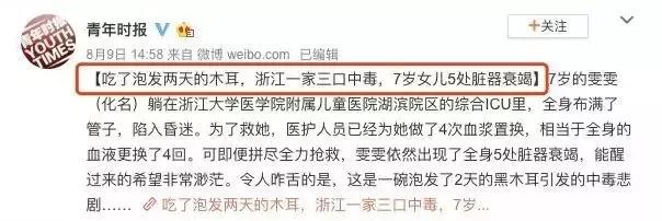 这里要提醒大家一下,不是木耳泡久了本身有毒,而是在长时间泡发的过程中,其中含有的细菌大量繁殖,使得木耳变质,大量的细菌毒素产生,这个时候再食用已经变质的木耳就可能引发中毒。