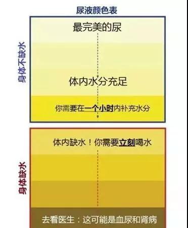 尿液呈浅黄色表明喝水量足够, 若尿液比较黄,就要立刻饮水500毫升左右; 若尿液呈土黄色,说明严重脱水,应及时就医。