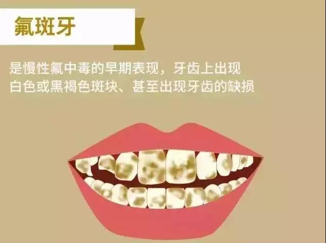 如果在牙齿发育矿化期间,长期饮用含氟量过多的水,会导致慢性氟中毒。氟对牙釉质的形成有抑制作用,会引起牙釉质发育不全或钙化不良。