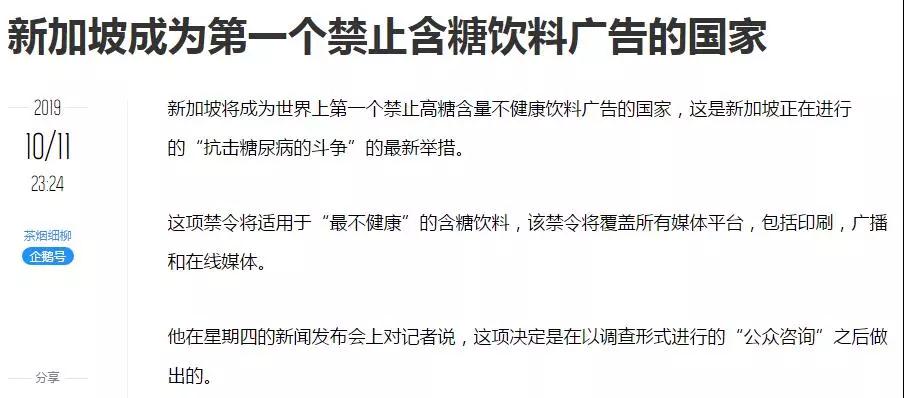 据CNN网站10月11日报道,新加坡将成为世界上第一个禁止含糖饮料广告的国家,该禁令针对“最不健康”的含糖饮料,范围包括印刷、广播和线上等等所有媒体平台,这也是该国“糖尿病战争”中的最新举措之一。